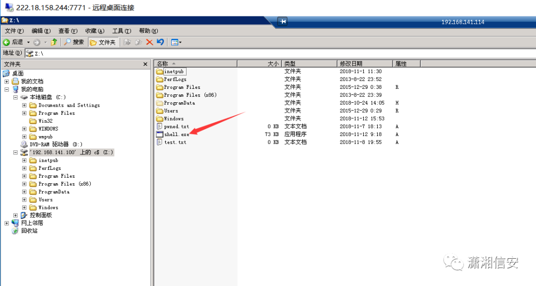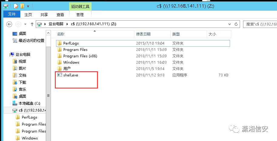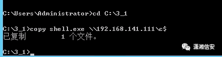net use z: \\192.168.141.111\c$使用copy命令将先前生成的shell.exe拷贝至靶机C盘