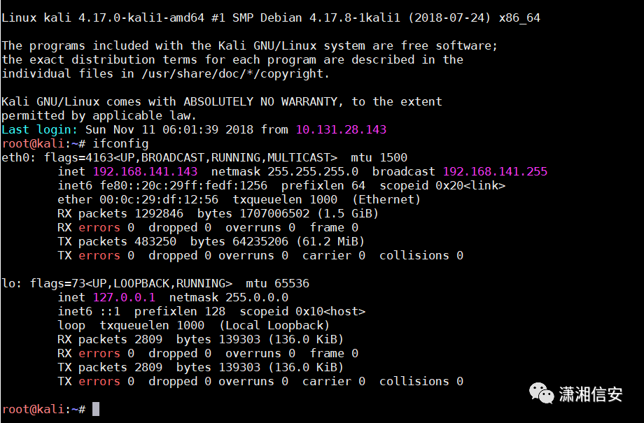 通过MobaXterm连接Kali(ip:192.168.141.143),用户名:root,密码:toor