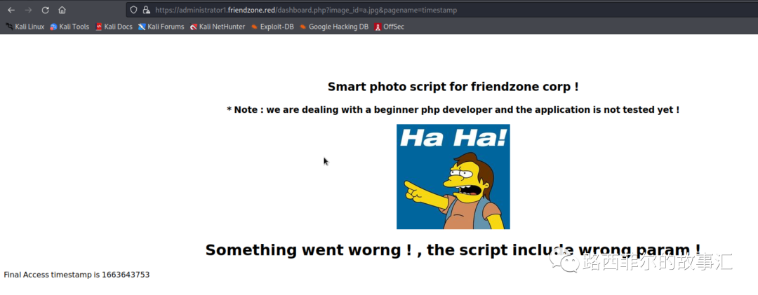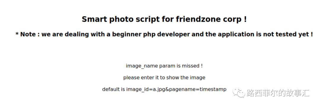 大概意思是说,这是一个用于朋友圈的智能照片脚本,但是这是一个初级的 php 开发人员写的代码,然后这个脚本还没经过测试,所以有一个参数被遗忘了,输入这个参数可以现实图片,默认是 image_id=a.jpg&pagename=timestamp