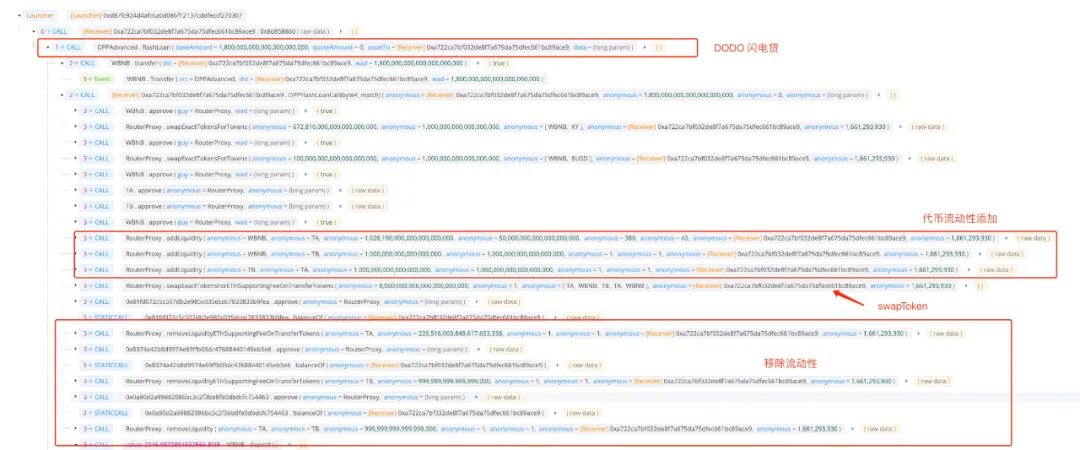https://bscscan.com/tx/0xc8db3b620656408a5004844703aa92d895eb3527da057153f0b09f0b58208d74,通过 Blocksec 的交易分析工具,不难发现本次攻击总共分为如下几个步骤,分别是 DODO FlashLoan, addLiquidity, SwapToken & Removeliquidity