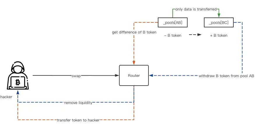通过查看函数的代码,不难发现核心的逻辑在 #12 行开始,根据 amountsIn 的大小来先对输出代币数量进行一个模拟,然后在 #16 行中的 _transferOut 函数扣除对应 _pool[sourcePair] 中的代币,最后后将输出的结果添加到 _pools[dstPair] 变量中,作为下一次兑换中的输入,后续再通过 #21 行的 swap 函数进行兑换。整体流程和 Uniswap 一致,唯一不同的地方是跨池代币兑换在这里不再涉及代币的转移,而只是 Router 合约中对应 _pools 变量的修改。再沿着这个思路继续想。由于代币没有发生转移,只是数据发生了转移,那么如果兑换过程中的列表中的代币都是用户可以控制的话,用户是否可以从别的池中转入代币到用户自己创建的池,把兑换出来的代币数量的数据记录在用户创建池的 _pools 变量上,然后又完成了上一个池的兑换呢 :D,这种情况下,我既从上个池完成了代币的兑换,又把别的池的代币数据加到用户自己的池的数据中,这个时候如果后续用户提现,就可以成功把别的池的资金从自己的创建的池取出来了。这里可能有点绕,一旦想通了这一点,再回看攻击者的操作,其实就是这个思路了。