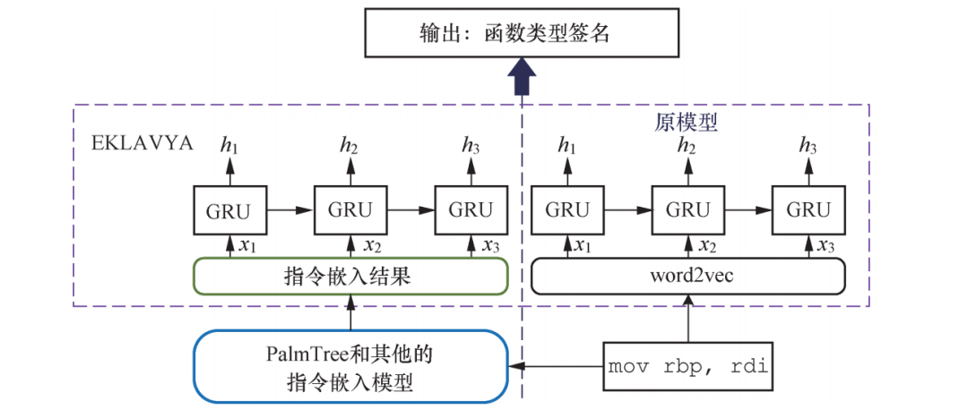 (2) 函数类型签名推断。函数类型签名推断是一项推断函数的参数个数及参数原始类型的任务。为了评估指令嵌入在该任务中的质量,我们选择了由Chua等人提出的EKLAVYA模型。该模型基于1个多层GRU网络并使用word2vec作为指令嵌入的方法。依据原论文,word2vec是在整个训练集上预训练得到的。然后,论文作者使用了1个GRU网络来推断函数类型签名。