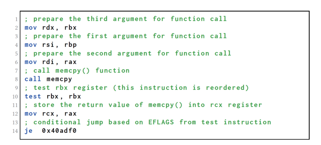 以图2所示的代码段为例,第10行的test指令和其前后的call指令、mov指令是没有关系的。test指令将其结果存入EFLAGS,因此被编译器提前到了mov指令之前,以使其远离第14行的je指令。而第14行的je指令将会加载第10行的test指令存入EFLAGS的结果。通过这一示例,我们可以得知,控制流图中的上下文关系可能会由于编译器优化而存在噪声。