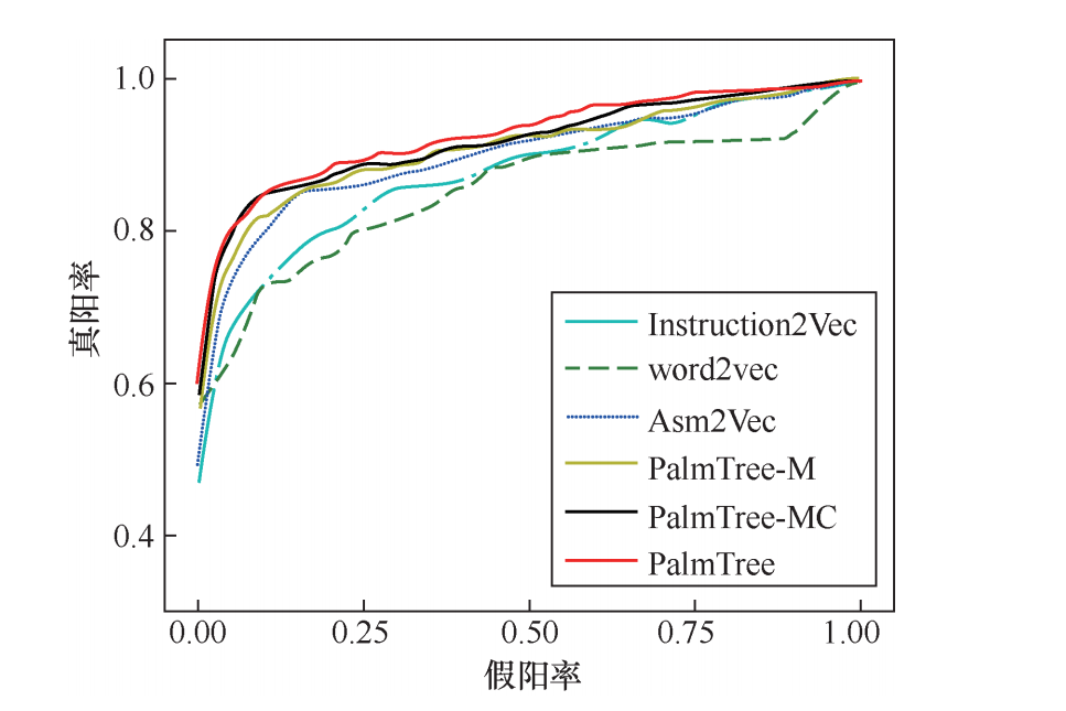 (2)基本块相似性搜索。在此项内部评估中,我们通过对其内部的指令嵌入进行平均,计算每一个基本块(即1个仅有1个入口和1个出口的指令序列)的嵌入。给定1个基本块,我们通过计算两个基本块嵌入的余弦距离来寻找和其语义等价的基本块。我们使用openssl-1.1.0h和glibc-2.29作为测试集(这两个项目没有包括在我们的训练集中)。我们使用O1,O2和O3优化等级对上述两个项目进行编译。Instruction2Vec、word2vec、Asm2Vec和PalmTree在基本块相似度搜索中的ROC曲线如图4所示。