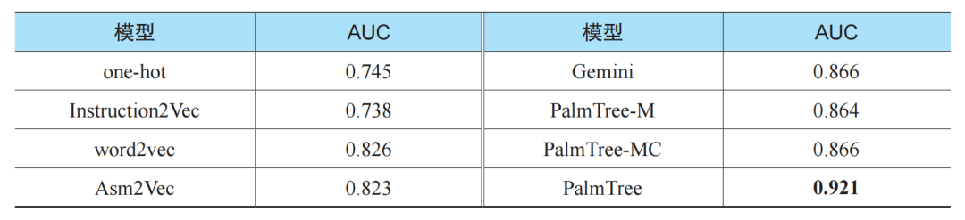 ■ 尽管PalmTree-M和PalmTree-MC并没有显著地优于Asm2Vec和Instruction2Vec,但PalmTree在两项实验中均取得了最好的结果,证明这一自动学习到的表征能够有效地区分操作符和操作数间的语义差别。