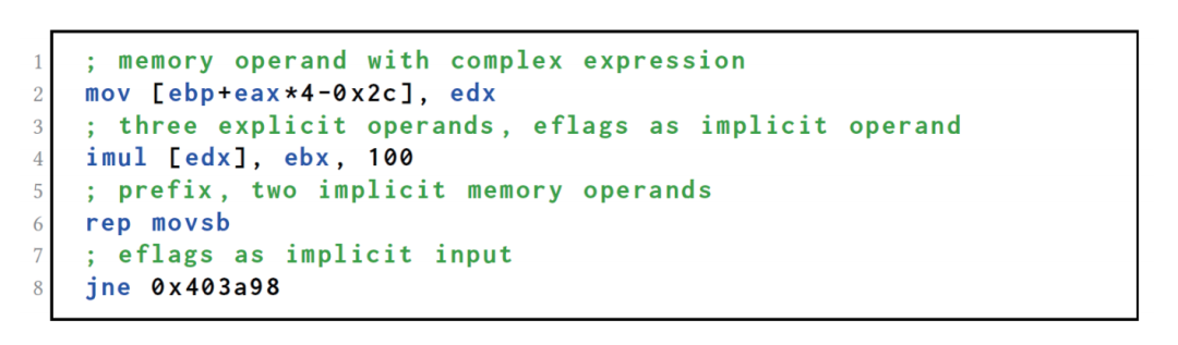 在x86架构中,一个指令可以有0~3个操作数。操作数可以是CPU寄存器、内存地址表达式、立即操作数等。一个内存操作数通过表达式base+index×scale+displacement进行计算。其中base和index是CPU寄存器,scale是一个常数,displacement可以是常数或字符,并且所有字段都是可选的。因此,指令的内存地址表达式存在很多变化,一些指令还存在隐式操作数。算术指令隐式地改变了EFLAGS,而条件跳转指令将EFLAGS作为一个隐式的输入。