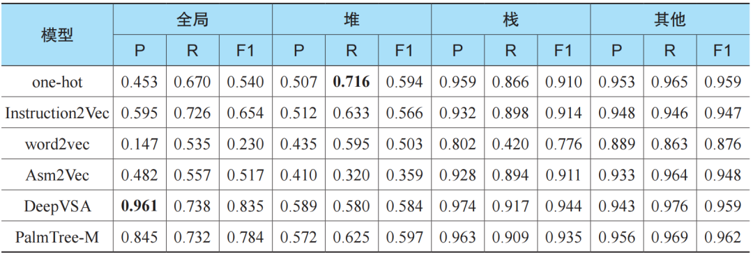 ■ 在全局和堆区域预测中,PalmTree显著优于原DeepVSA及其他的基线方法。在栈和其他区域的预测中略优于其他的方法。