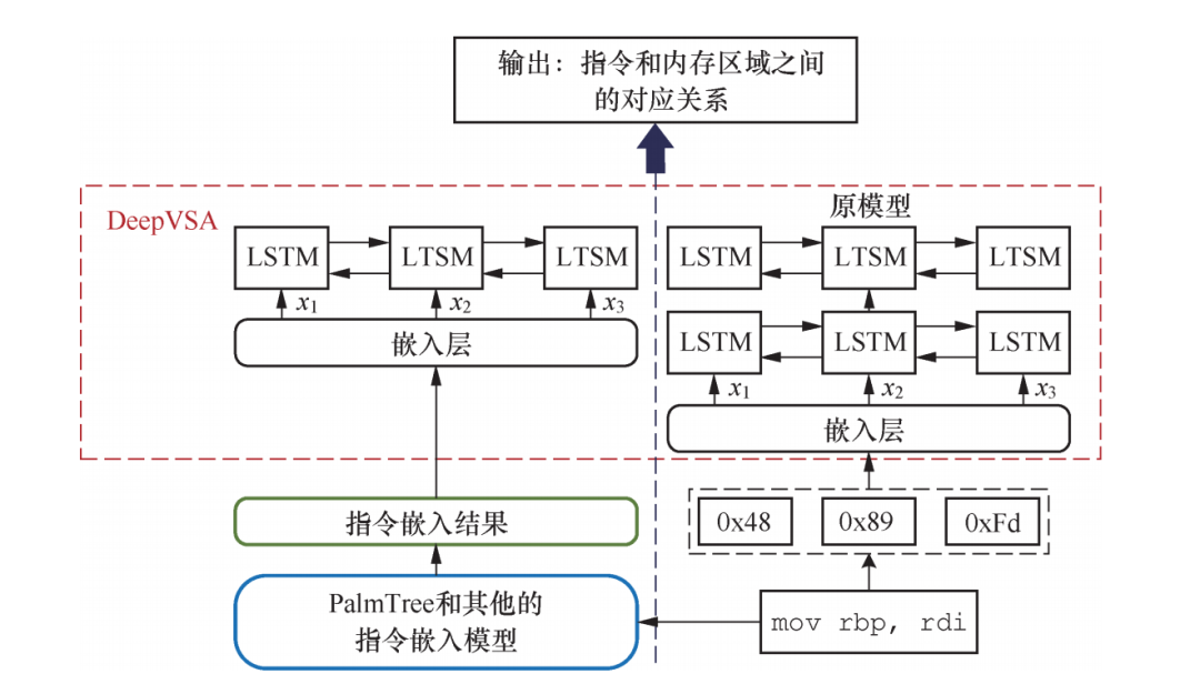 在我们的实验中,我们使用不同的指令嵌入来替换DeepVSA中已有的指令嵌入生成模型。我们使用了DeepVSA原有的测试和训练数据集,并比较不同嵌入的预测精度。由于原有的数据集仅包含原始字节,因此我们首先对这些字节进行了反汇编。我们在LSTM网络之前增加了一个嵌入层以进一步调整指令嵌入,如图7所示。