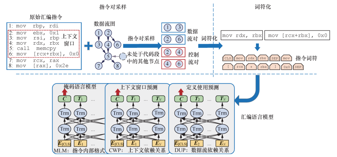 该系统中的主要模块,即汇编语言模型(assembly language model)基于BERT模型。在训练过程后,我们使用BERT模型的倒数第二层的隐藏状态(hidden states)的均值池化(mean pooling)作为指令嵌入的结果。指令对采样模块主要负责从二进制代码中基于控制流和数据流关系采样指令对。