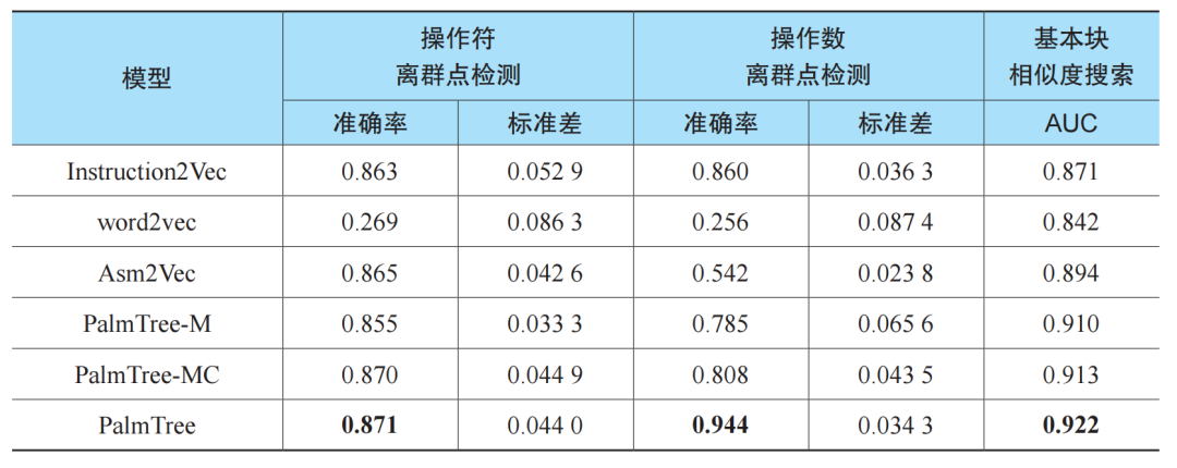 PalmTree可以通过自监督的训练任务在大规模、无标注的二进制语料库上进行预训练。PalmTree基于BERT模型,但使用了新设计的、能够捕捉汇编语言内在特点的预训练任务。具体而言,我们提出使用3个预训练任务来训练PalmTree:MLM、CWP和DUP。我们设计了一系列的内部和外部评估,以系统性地评价PalmTree和其他指令嵌入模型。实验结果表明,和已有模型相比,PalmTree在内部评估中有最好的表现。而在使用多个下游任务的外部评估中,PalmTree显著优于其他基线模型,并且能够显著提升下游应用的效果。因此可以得出结论:PalmTree能够产生高质量的指令嵌入,其生成的指令嵌入对不同下游二进制代码分析任务均有提升作用。