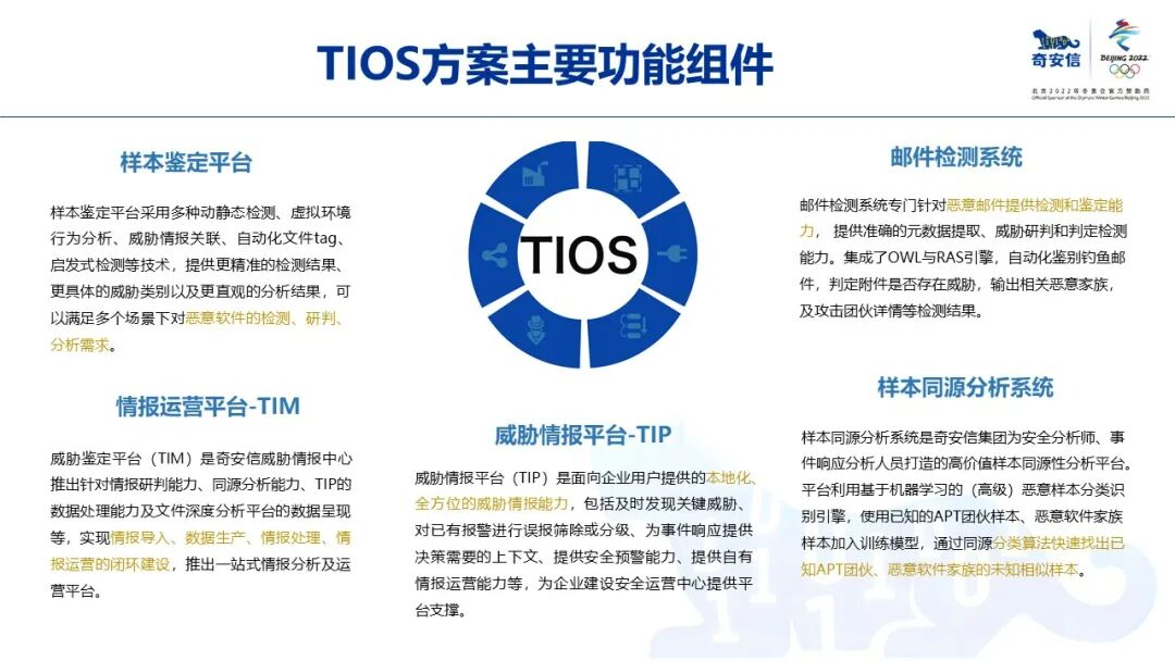 奇安信威胁情报运营系统(简称:TIOS)是由奇安信威胁情报中心资深安全研发人员,专为企业及安全分析师打造的本地化威胁情报中心分析运营平台,是一套组合级的解决方案产品。