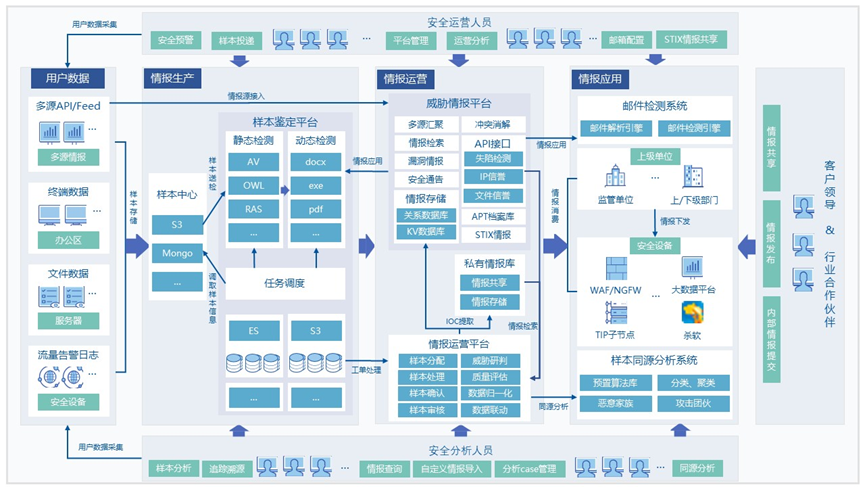 该平台融合公有云和私有云多数据情报来源,包含样本鉴定平台、威胁情报平台-TIP、邮件检测系统、样本同源分析系统、情报运营平台等安全组件,可助力客户构建本地情报生态体系、打造稳定可靠运营体系、扩展威胁情报业务能力、增强本地科技创新能力和筑建安全可控分析架构。