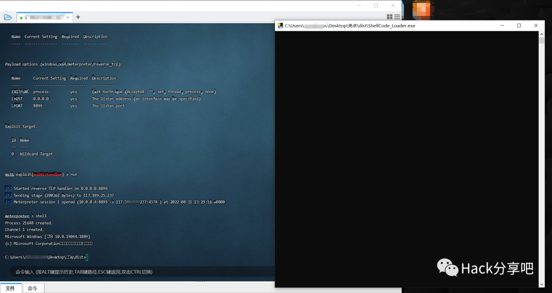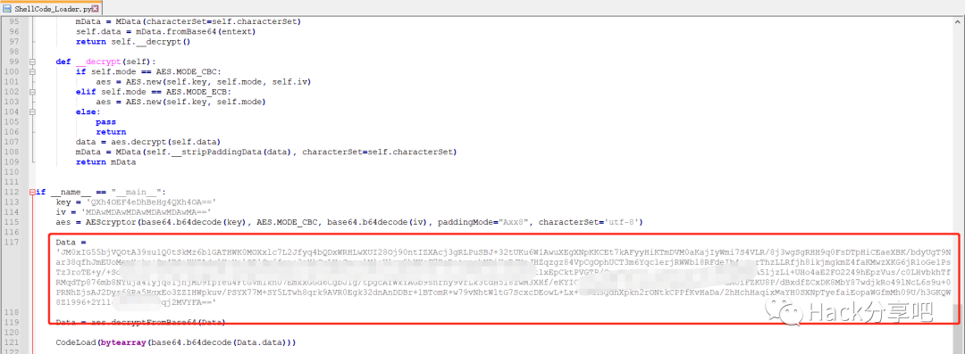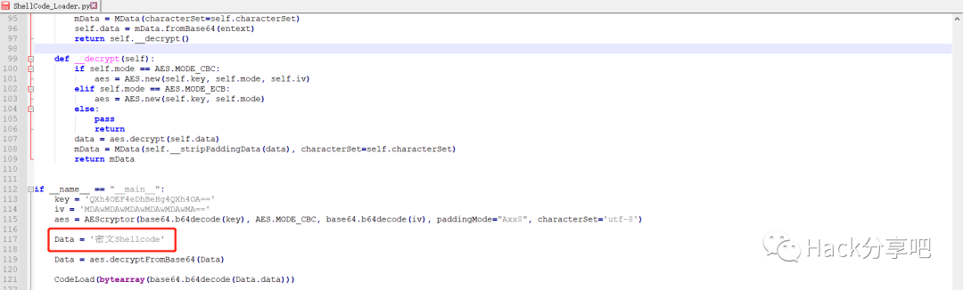 将生成的密文ShellCode 填至 ShellCode_Loader.py 里的 Data = '密文Shellcode' 处 示例: