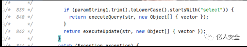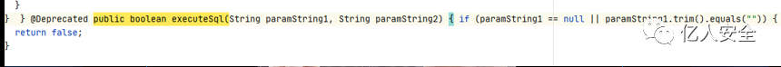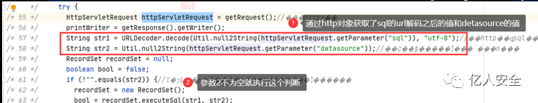 geDatasBySql的方法是获取了http实例并获取http的sql和datasource的参数,并对这个datasource参数进行判断,当sql语句执行成功后就直接将bool参数赋值为ture,然后进行判断如果不为true的话就直接跳出回显空,否则就继续将sql返回的数据进行json数组的转换输出回显。