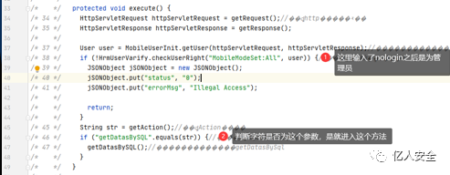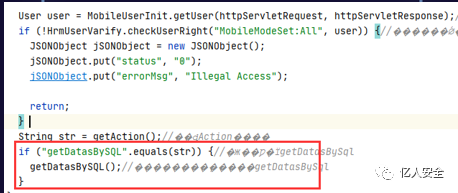 对登录的账号进行判断是否为admin/sysadmin账号,获取Action参数进行判断是否为getDatasBySql参数,然后直接调用getDatasBySql方法
