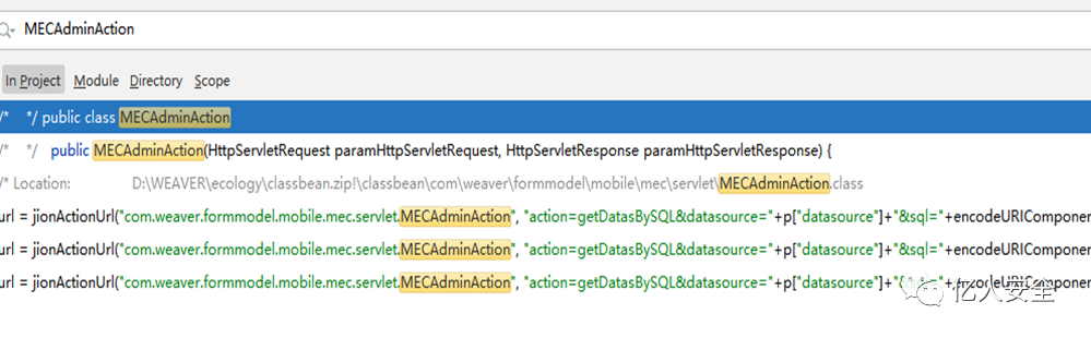 这时候思路应该很明了了,全局搜索这个类的路径“com.weaver.formmodel.mobile.mec.servlet.MECAdminAction”,但是这没前端代码只有js文件里面匹配到了,而且还是插件的js,但是默认是存在的,所以这个漏洞是存在的,可以构造http://127.0.0.1/mobilemode/Action.jsp?invoker=com.weaver.formmodel.mobile.mec.servlet.MECAdminAction&action=getDatasBySQL&datasource=&sql=select%20\*%20from%20SystemSet来进行访问。