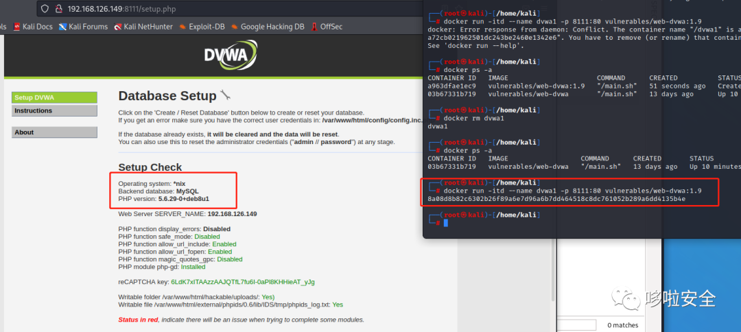 `docker run -itd --name dvwa1 -p 8111:80 vulnerables/web-dvwa:1.9`下载低版本的mysql测试