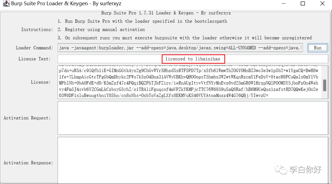 后面就依次复制listen到BP,BP生成的Request复制到注册机,注册机生成的Response复制到BP打开就有了我的这个效果。