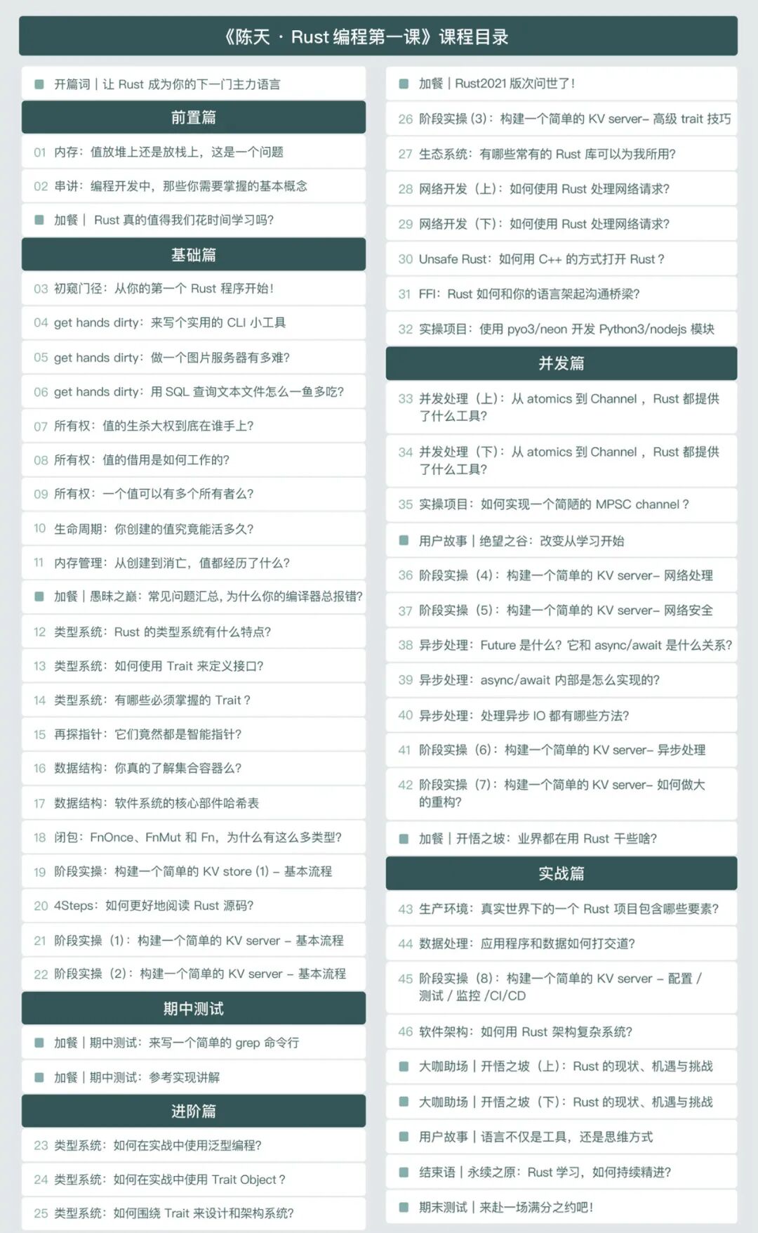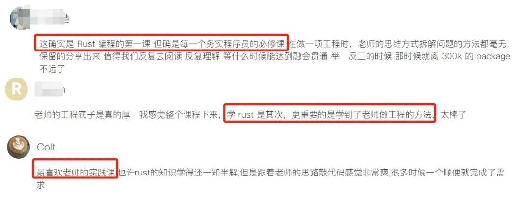 所以专栏每一模块都设计了实践内容,带你把 Rust 应用在生产环境中,以及用 Rust 解决实际问题。老师的思维方式拆解问题的方法都毫无保留的分享出来,值得反复去阅读、反复理解。