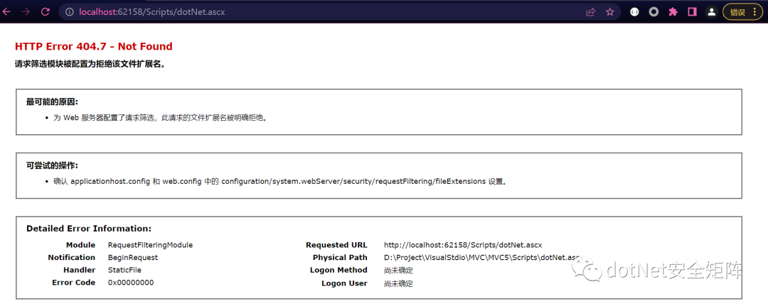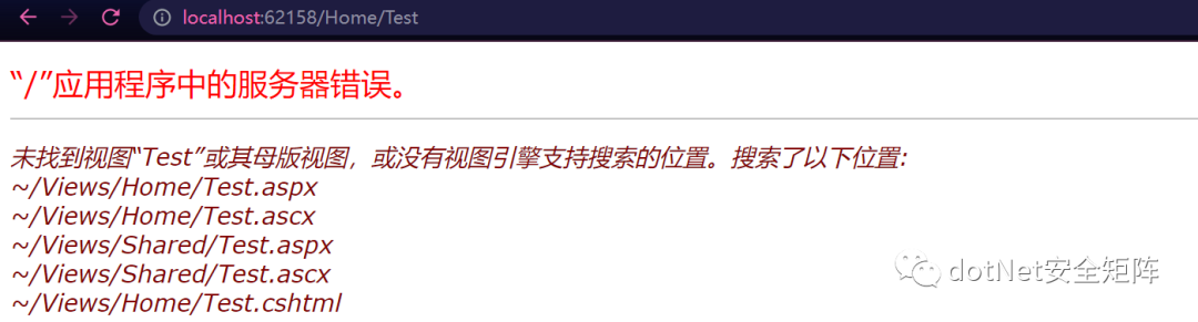 所以要曲线救国的方法让ascx执行,所以MVC被派上了用场,MVC里的控制器对应的每个方法都有一个视图页,默认位于Views目录下,星主建了一个Test方法,并没有建对应的视图页(MVC默认的视图是新建cshtml扩展名),访问后抛出视图页没找到的异常,仔细观察MVC会按优先级顺序自动去找aspx -> ascx -> cshtml 扩展名文件