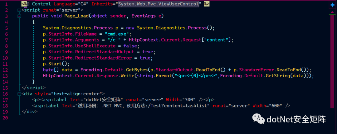 这就说明ascx被解析的优先级高于默认的cshtml,那自然就有了应用的场景,比如WAF拦截aspx,cshtml等扩展名,我们可以跨目录上传到views控制器目录下,webshell,我这是Test.ascx,继承System.Web.Mvc.ViewUserControl,Webshell代码实现如下