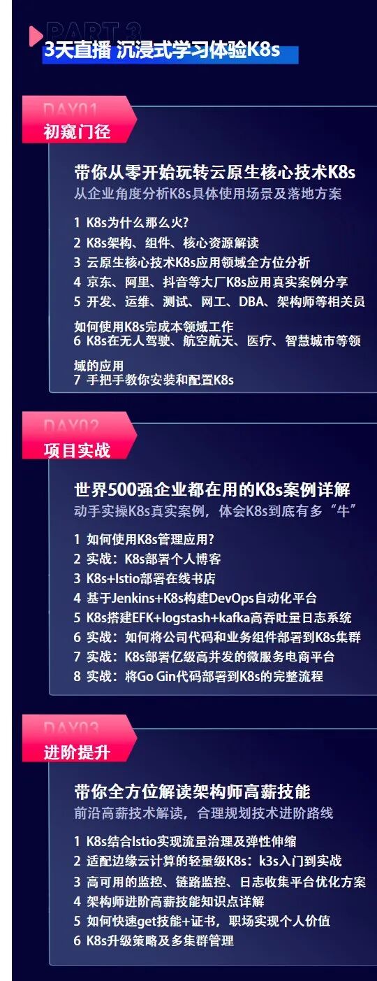3天课程会介绍K8s架构、组件、核心资源、应用领域、大厂真实案例,带你实战练习基于K8s的DevOps、微服务、EFK等世界500强真实项目。而且听完课,就可在群里向韩先超老师提问,有问题当堂解决,非常高效!这个课程非常适合想要学习和了解K8s的同学。