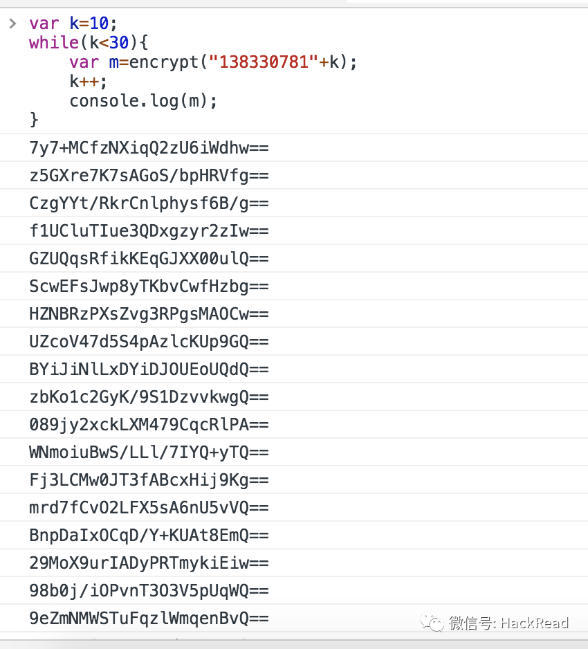 var k=10;while(k<30){var m=encrypt("138330781"+k);k++;console.log(m);}