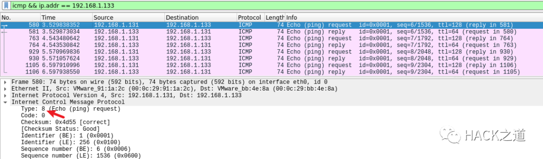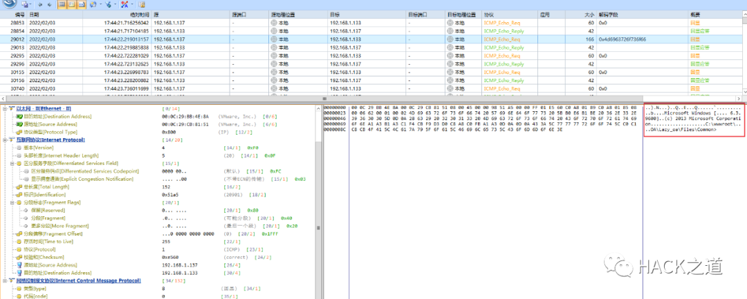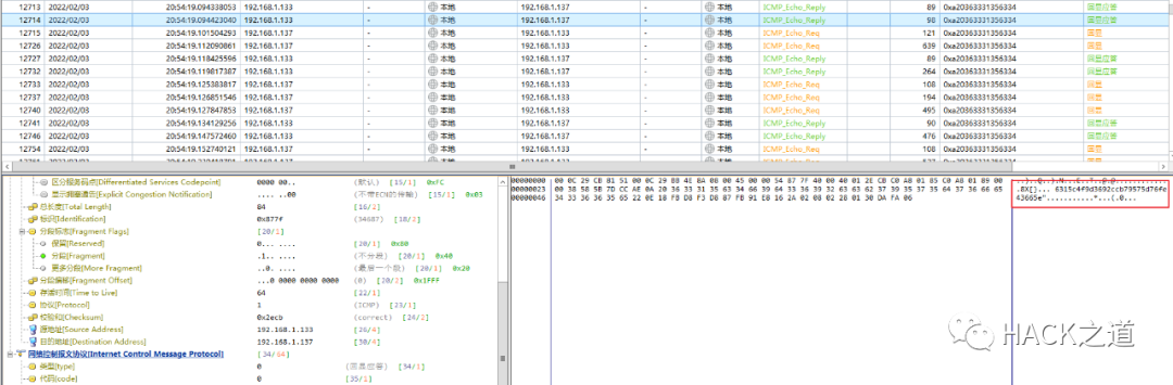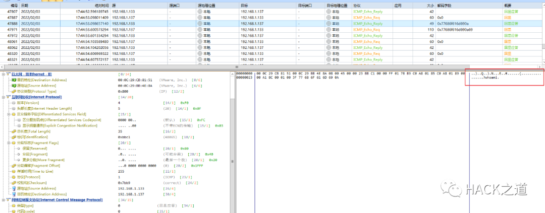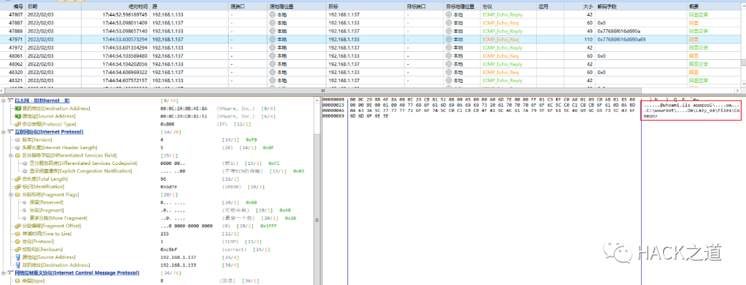 在icmpsh中,其交互过程的数据包中请求包和响应包长度明显不相同,并且Data字段内容明显为明文的敏感信息。