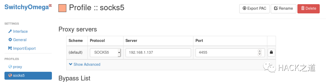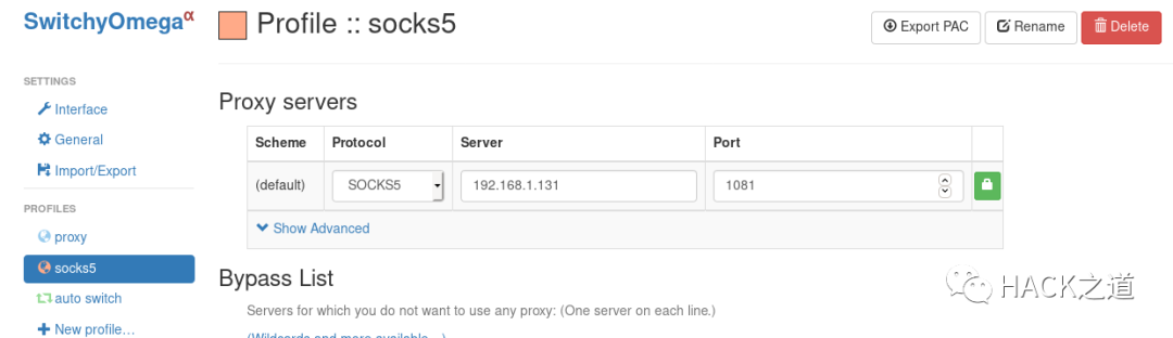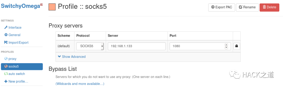 数据流向为socks5代理-> 1080 -> 8888 -> 9999 -> 7777 -> rssocks