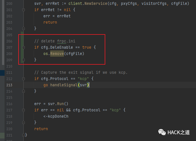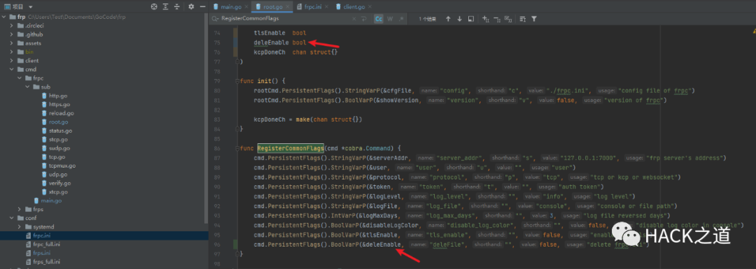 在frp/cmd/frpc/sub/root.go中,注册变量,在RegisterCommonFlags函数中注册参数,最后在startService运行检测函数中添加自删除操作
