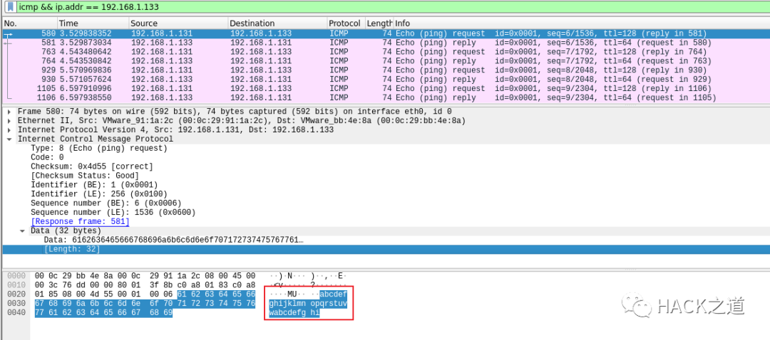 单组数据包Data字段内容中,Windows为abcdefghijklmnopqrstuvwabcdefghi,Linux下为!”#$%&’()+,-./01234567。