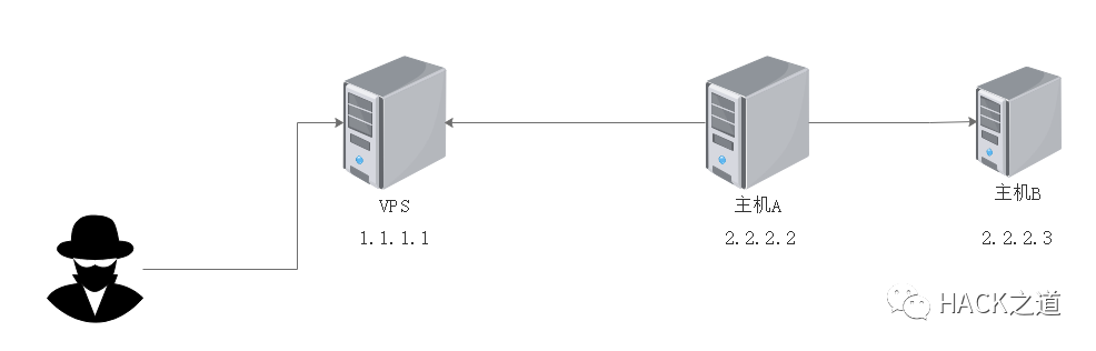 主机A(2.2.2.2)、B(2.2.2.3),公网VPS(1.1.1.1)。