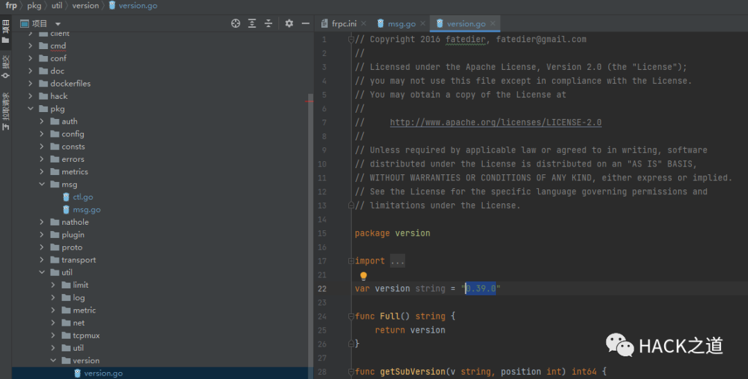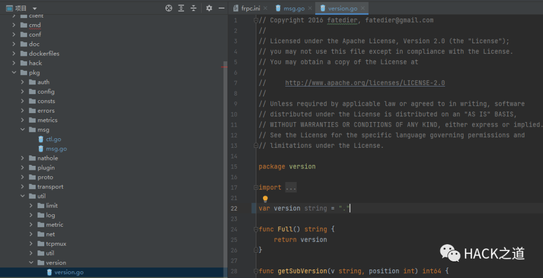 定位到frp\pkg\util\version\version.go文件,修改版本特征