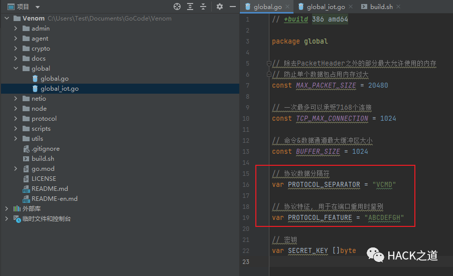 venom的特征在于协议的数据分隔符和在端口重用时的鉴别符号,修改global/global.go后,重新编译,即可实现特征隐藏。