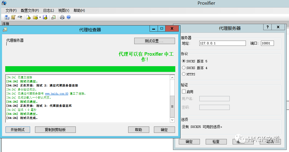 主机Aew -s lcx_tran -l 1080 -f 2.2.2.3 -g 8888主机Bew -s ssocksd -l 8888通过proxifier代理工具访问2.2.2.2:1080