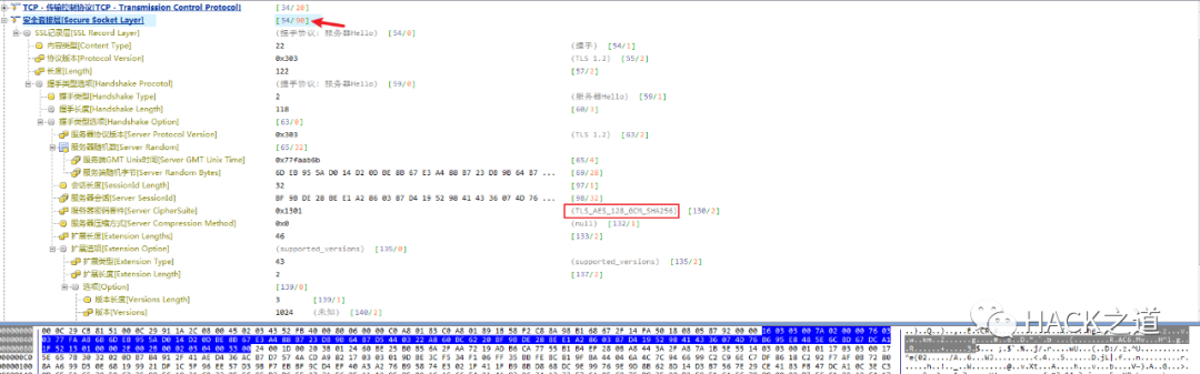 服务端选定加密算法,理论上也是90字节大小的TLS-hello报文,向客户端发起应答
