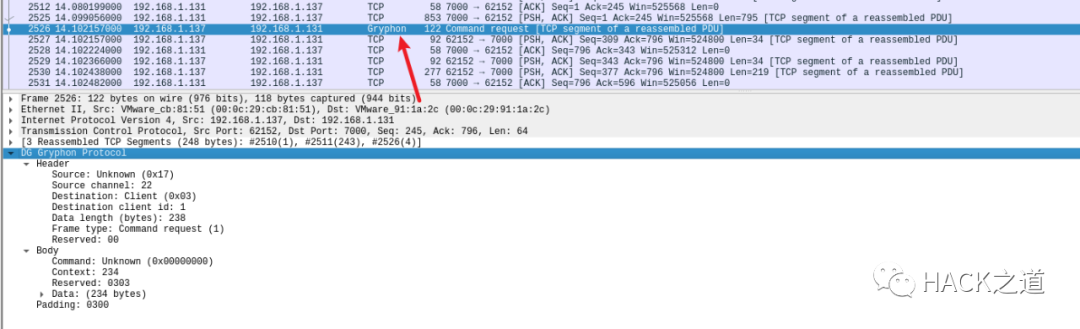 利用wireshark详细分析,发现wireshark识别该报文为“Gryphon”协议,“Gryphon”协议为工控协议,用于车用通讯协定