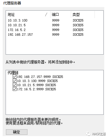 VPSew -s rcsocks -l 1080 -e 8888主机Aew -s lcx_slave -d 1.1.1.1 -e 8888 -f 2.2.2.3 -g 9999主机Bew -s lcx_listen -l 9999 -e 7777主机Cew -s rssocks -d 2.2.2.3 -e 7777通过proxifier代理工具访问1.1.1.1:1080