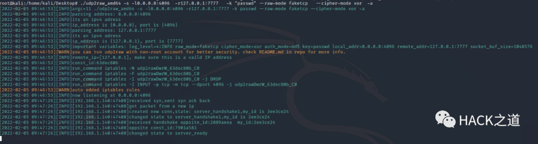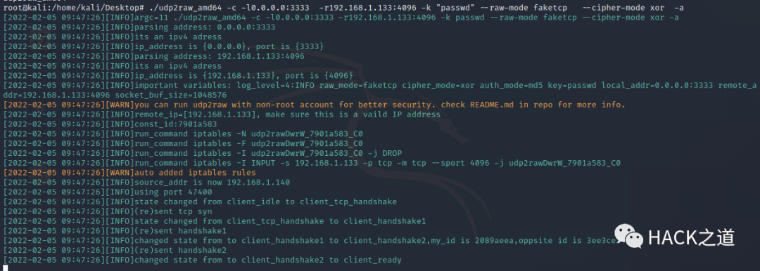 在server端运行:./udp2raw_amd64 -s -l0.0.0.0:4096 -r127.0.0.1:7777 -k "passwd" --raw-mode faketcp --cipher-mode xor -a在client端运行:./udp2raw_amd64 -c -l0.0.0.0:3333 -r192.168.1.133:4096 -k "passwd" --raw-mode faketcp --cipher-mode xor -a