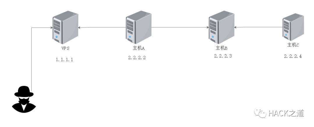 主机A(2.2.2.2)、B(2.2.2.3)、C(2.2.2.4),公网VPS(1.1.1.1)。